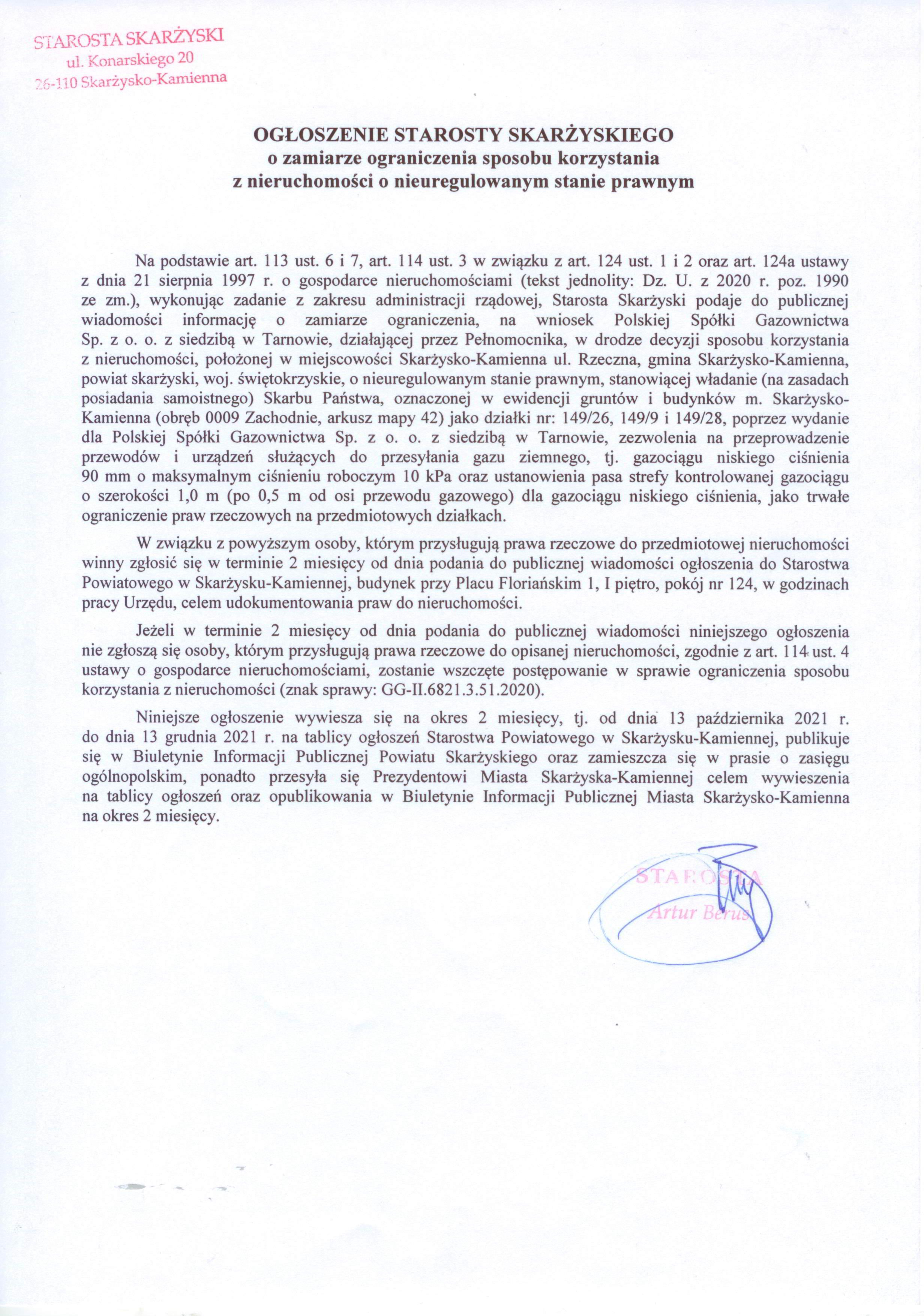 Niniejsze ogłoszenie wywiesza się na okres 2 miesięcy, tj. od dnia 13 października 2021 r. do dnia 13 grudnia 2021 r. na tablicy ogłoszeń Starostwa Powiatowego w Skarżysku-Kamiennej, publikuje się w Biuletynie Informacji Publicznej Powiatu Skarżyskiego oraz zamieszcza się w prasie o zasięgu ogólnopolskim, ponadto przesyła się Prezydentowi Miasta Skarżyska-Kamiennej celem wywieszenia na tablicy ogłoszeń oraz opublikowania w Biuletynie Informacji Publicznej Miasta Skarżysko-Kamienna na okres 2 miesięcy.